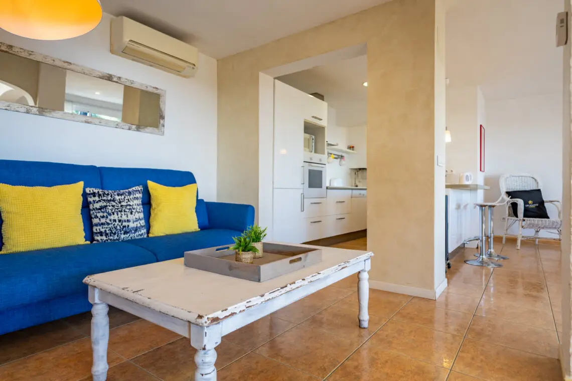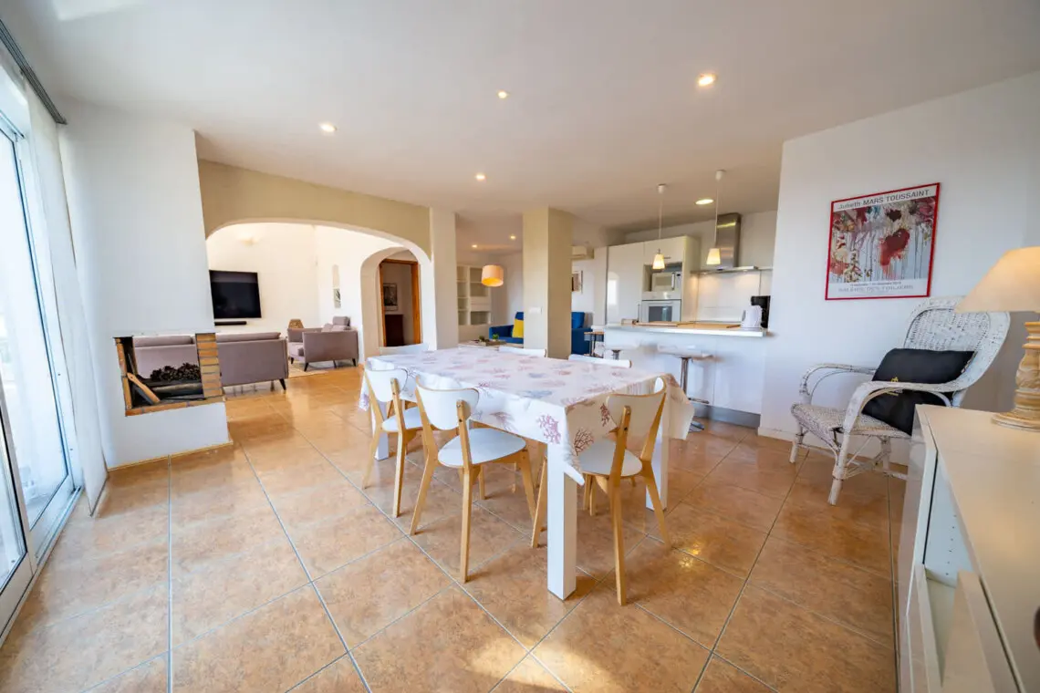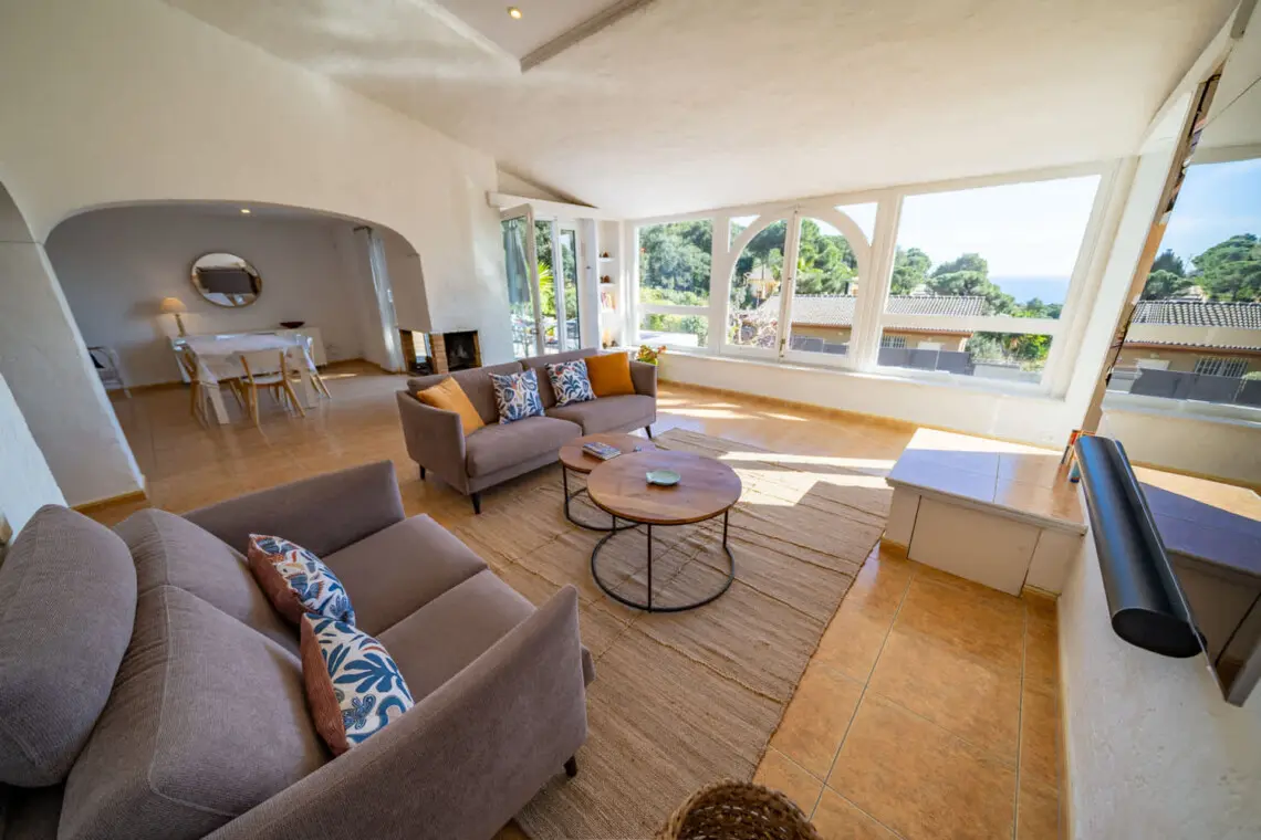 Salón-Comedor: Un espacio abierto y diáfano con grandes ventanales en forma de arco que inundan la estancia de luz natural y enmarcan el mar. Perfecto para relajarse viendo la televisión o disfrutando de la compañía.