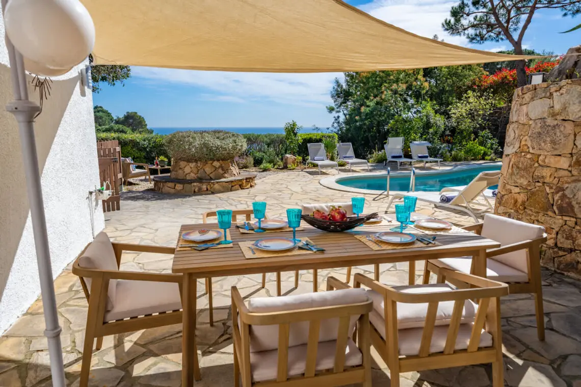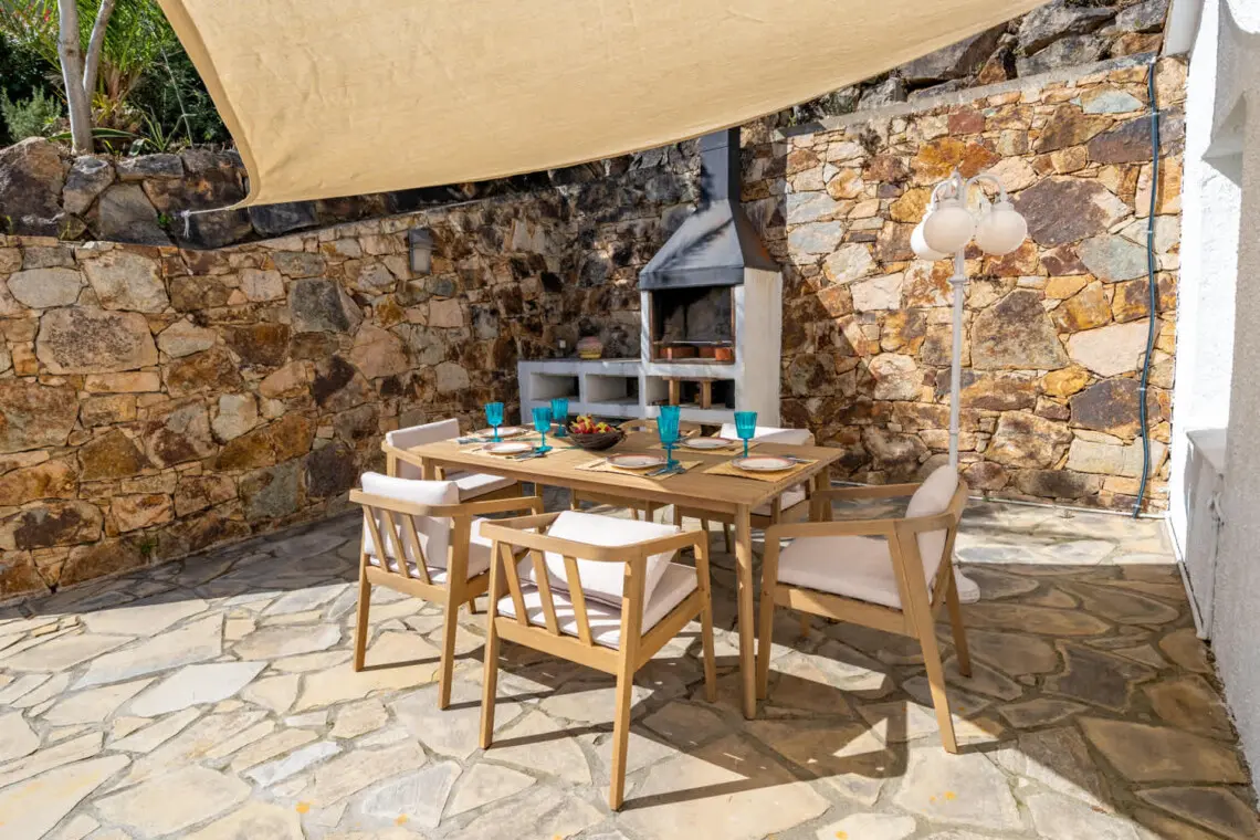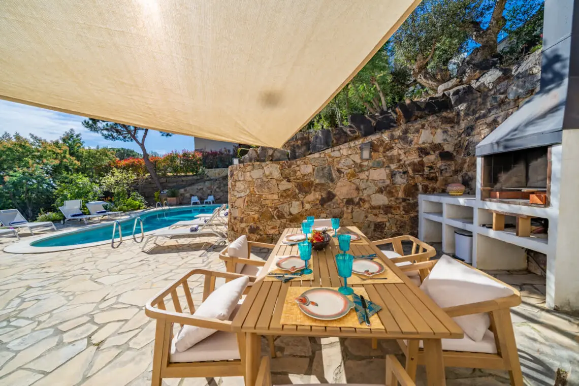 Comedor al aire libre y Barbacoa: Junto a la zona de piscina, encontrarás un comedor exterior cubierto por un toldo vela y una gran barbacoa de obra. El rincón ideal para disfrutar de comidas y cenas de verano con la brisa y las vistas al mar.