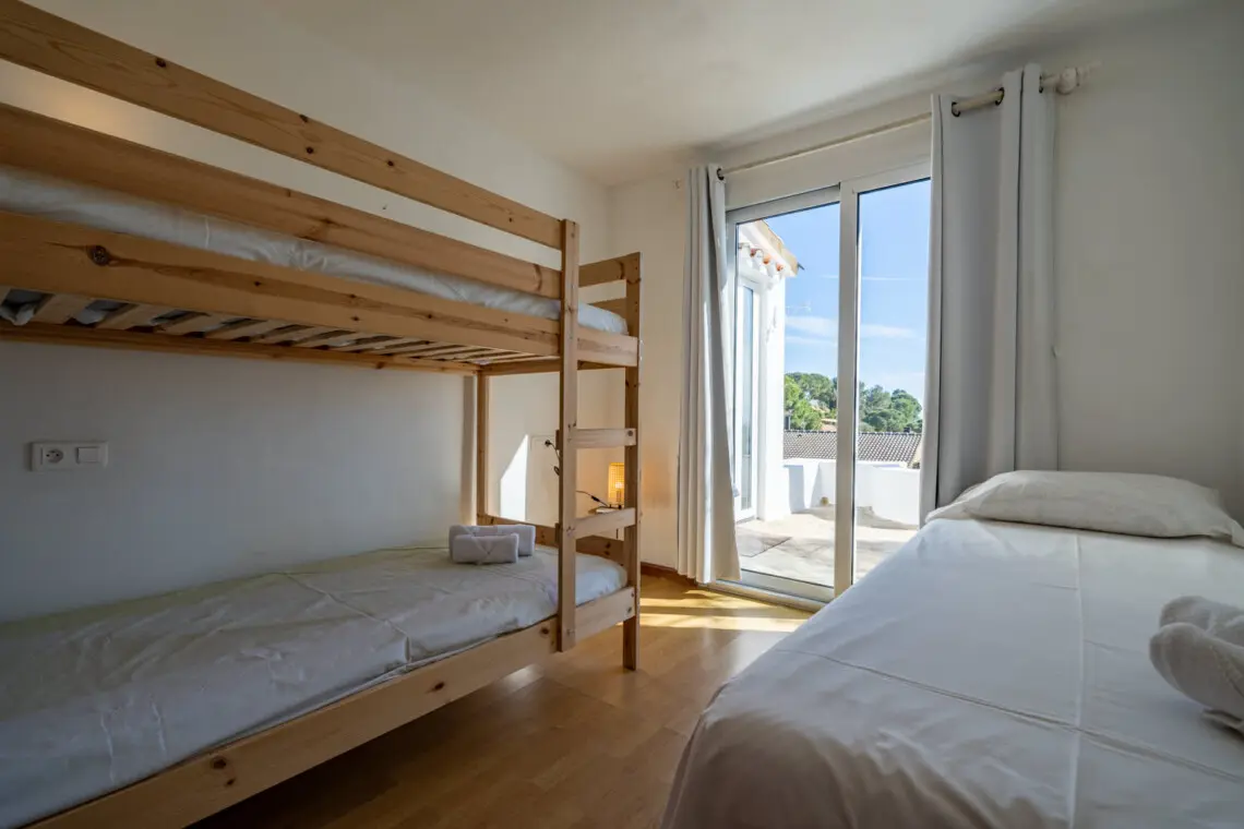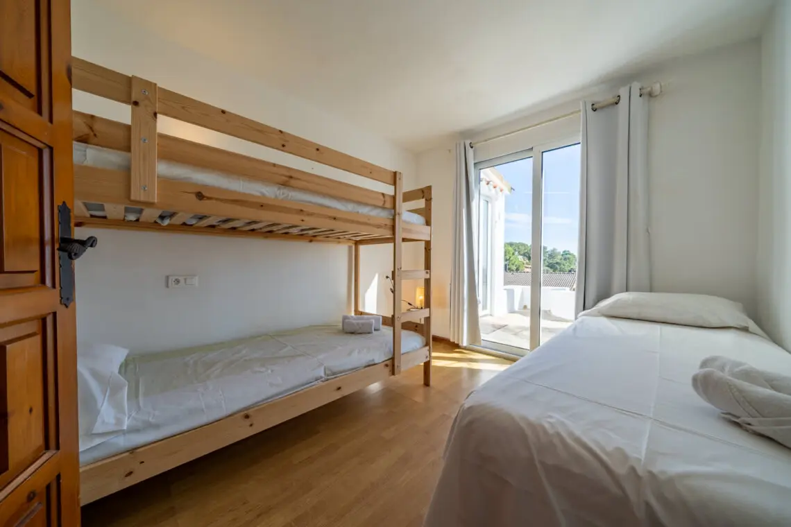 Dormitorio 3: Perfecta para niños o amigos, equipada con una litera de madera de pino y una cama individual adicional.