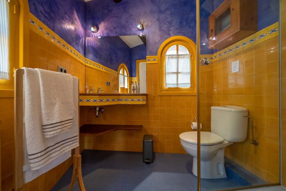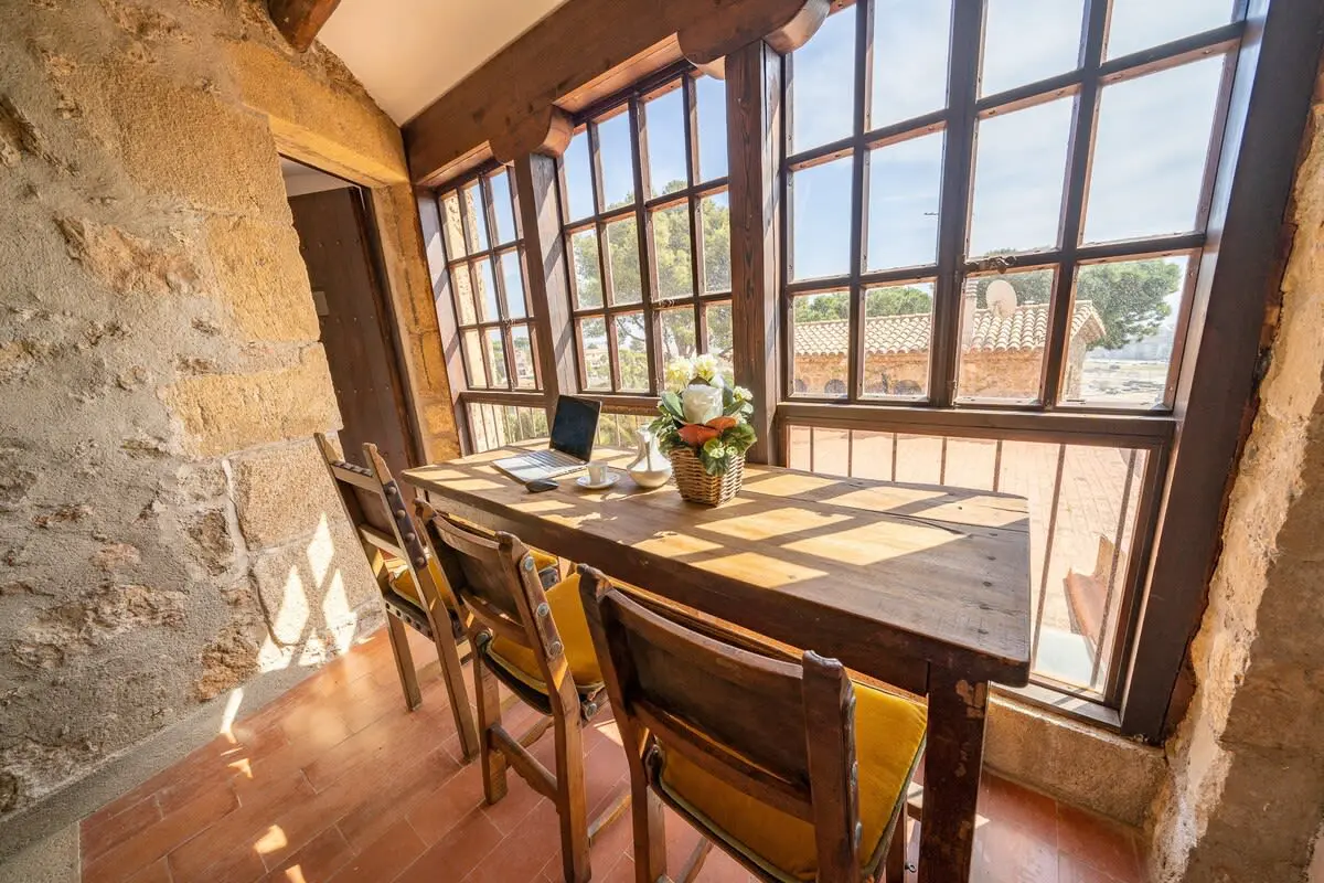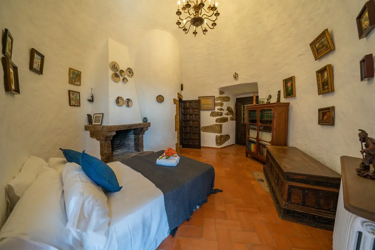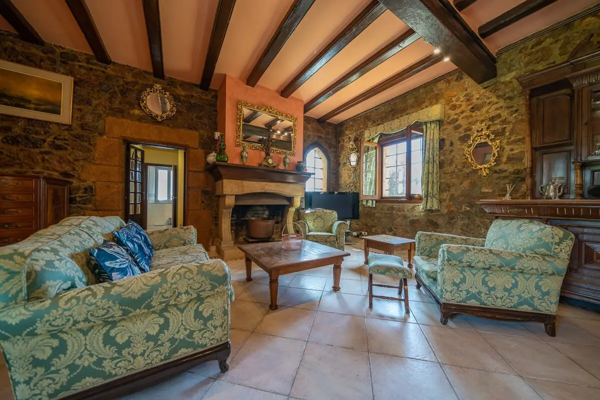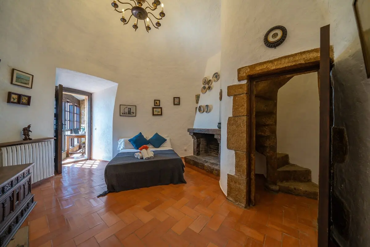 The interior of the castle can accommodate up to 12 people and is divided into 4 bedrooms, including a suite with a king size bed and 2 single beds (and A/C), another bedroom with a king size bed and bathroom with bathtub (and A/C), another more romantic bedroom with bathroom and shower and a last bedroom with 2 single beds and access to the garden. In addition, in a small living room there is a double sofa bed. There are 3 complete bathrooms and a toilet. The main living room is spacious and has two levels, with different rest areas. The furniture and decoration are in keeping with the style of the castle. The kitchen is fully equipped and has a table and chairs. It also has an area with a work table.