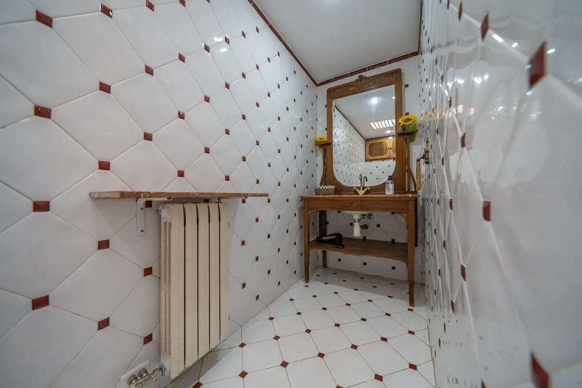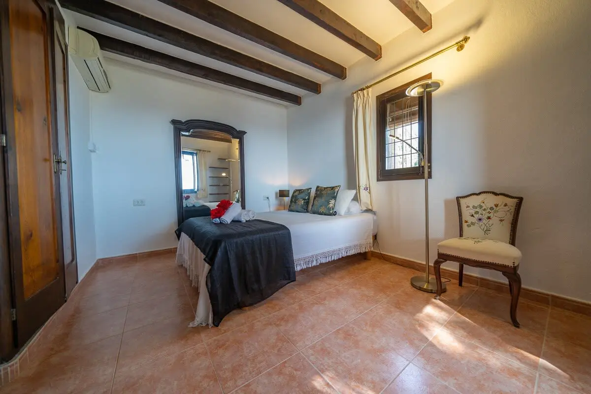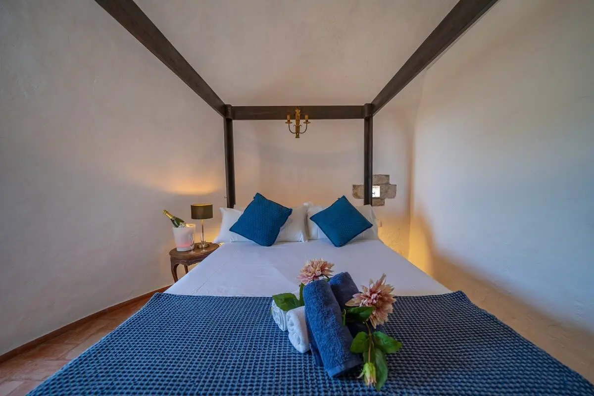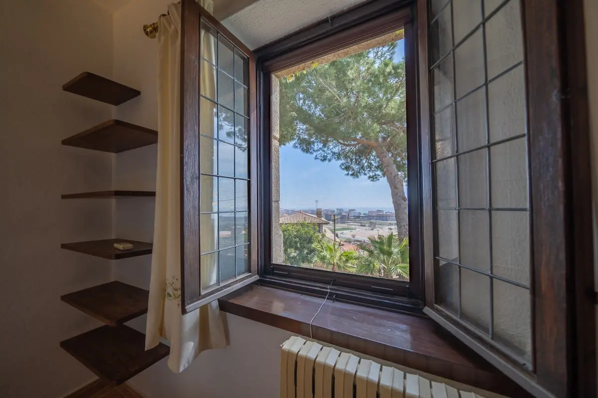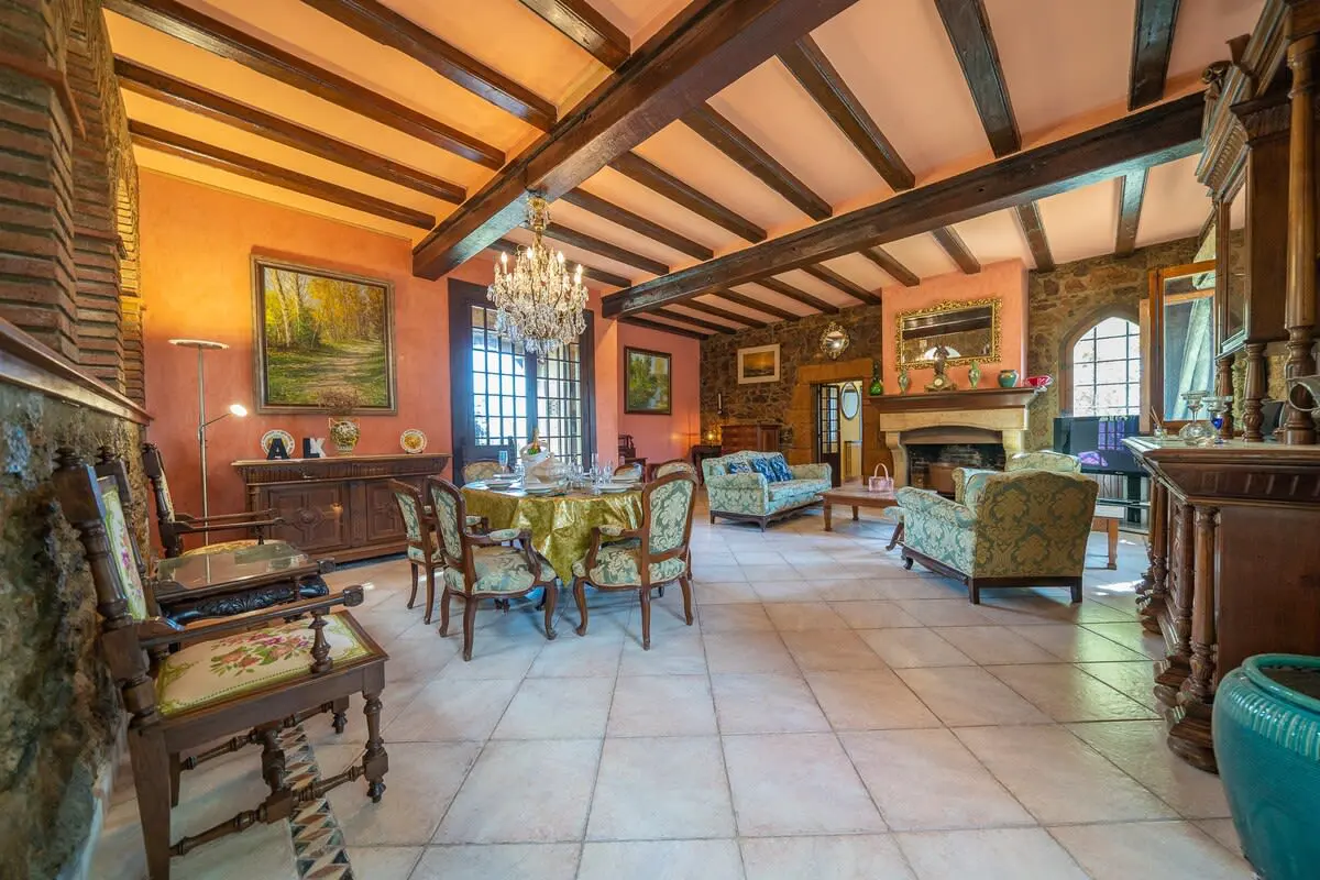 The interior of the castle can accommodate up to 12 people and is divided into 4 bedrooms, including a suite with a king size bed and 2 single beds (and A/C), another bedroom with a king size bed and bathroom with bathtub (and A/C), another more romantic bedroom with bathroom and shower and a last bedroom with 2 single beds and access to the garden. In addition, in a small living room there is a double sofa bed. There are 3 complete bathrooms and a toilet. The main living room is spacious and has two levels, with different rest areas. The furniture and decoration are in keeping with the style of the castle. The kitchen is fully equipped and has a table and chairs. It also has an area with a work table.