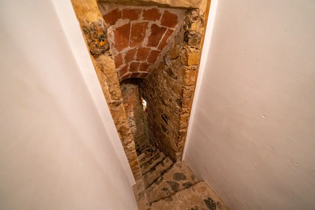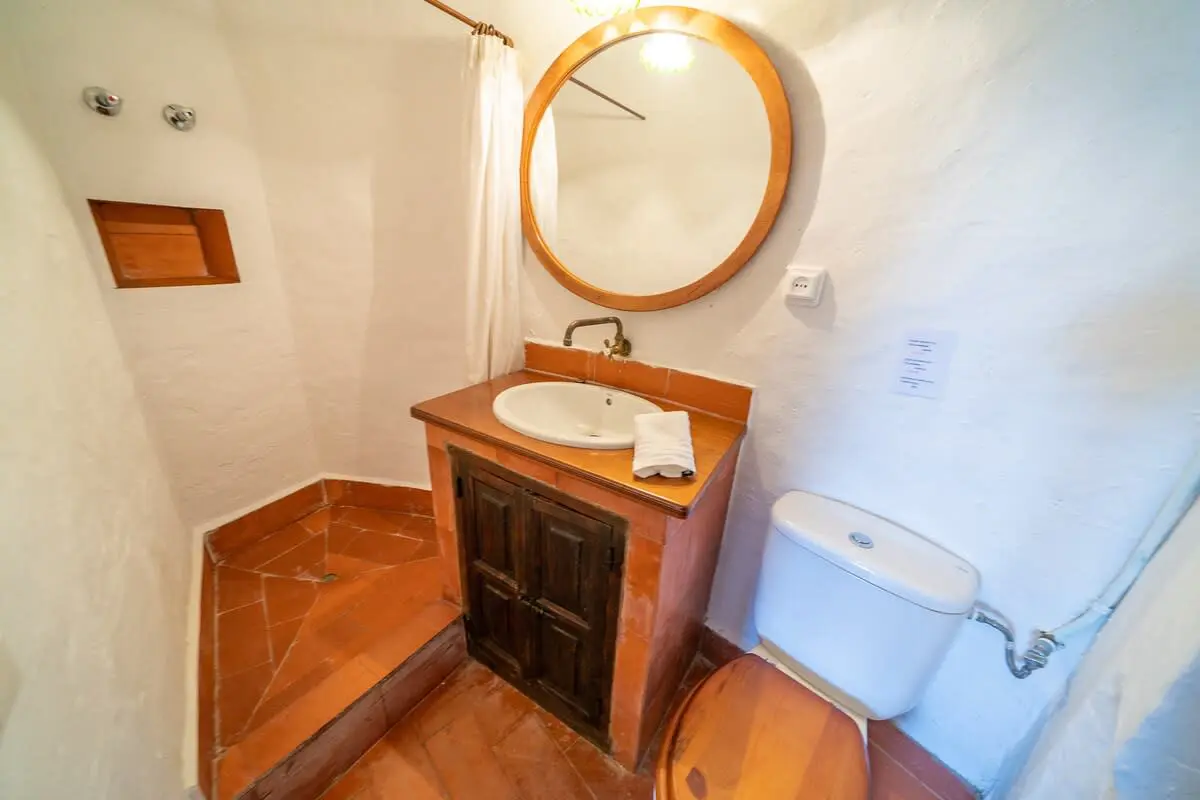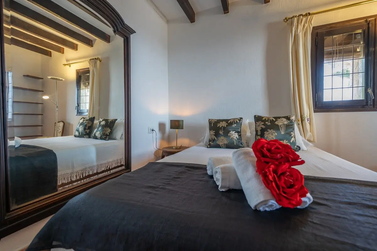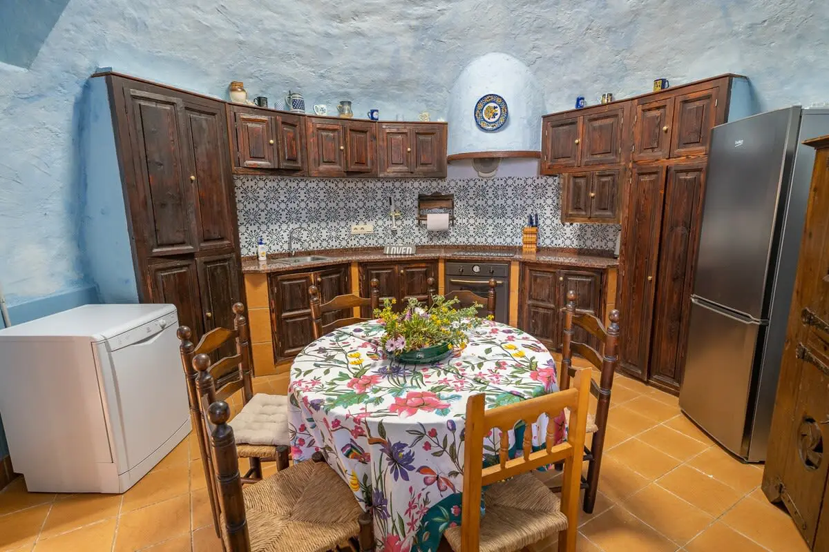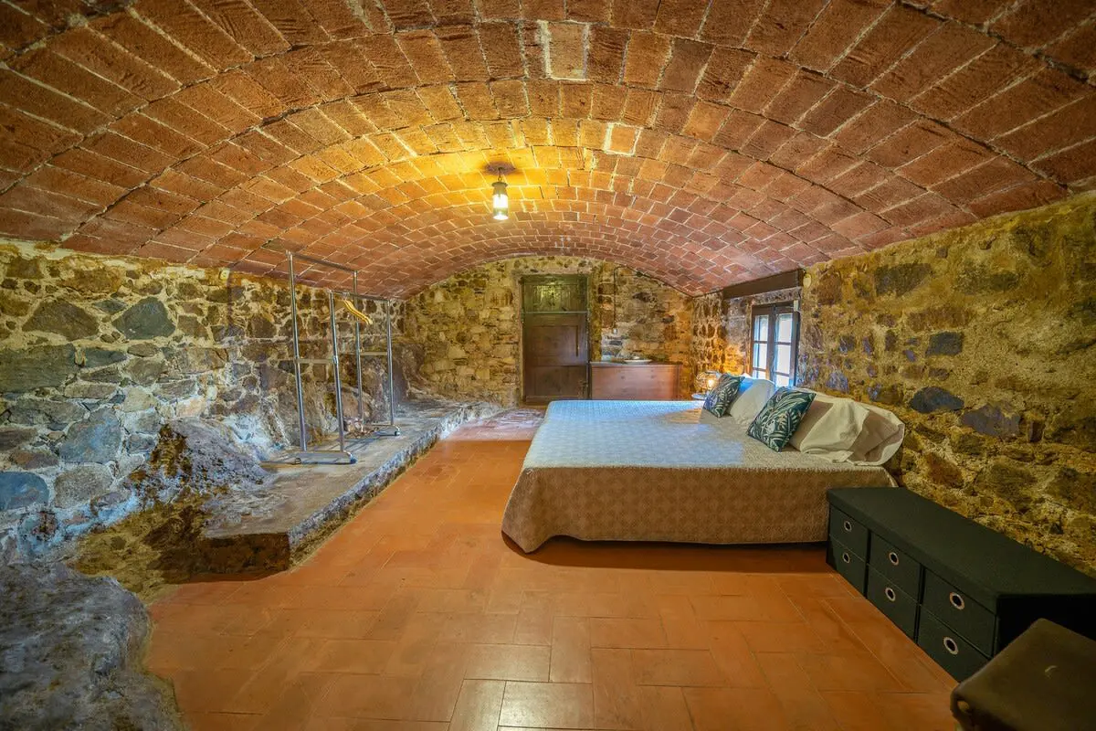 The interior of the castle can accommodate up to 12 people and is divided into 4 bedrooms, including a suite with a king size bed and 2 single beds (and A/C), another bedroom with a king size bed and bathroom with bathtub (and A/C), another more romantic bedroom with bathroom and shower and a last bedroom with 2 single beds and access to the garden. In addition, in a small living room there is a double sofa bed. There are 3 complete bathrooms and a toilet. The main living room is spacious and has two levels, with different rest areas. The furniture and decoration are in keeping with the style of the castle. The kitchen is fully equipped and has a table and chairs. It also has an area with a work table.