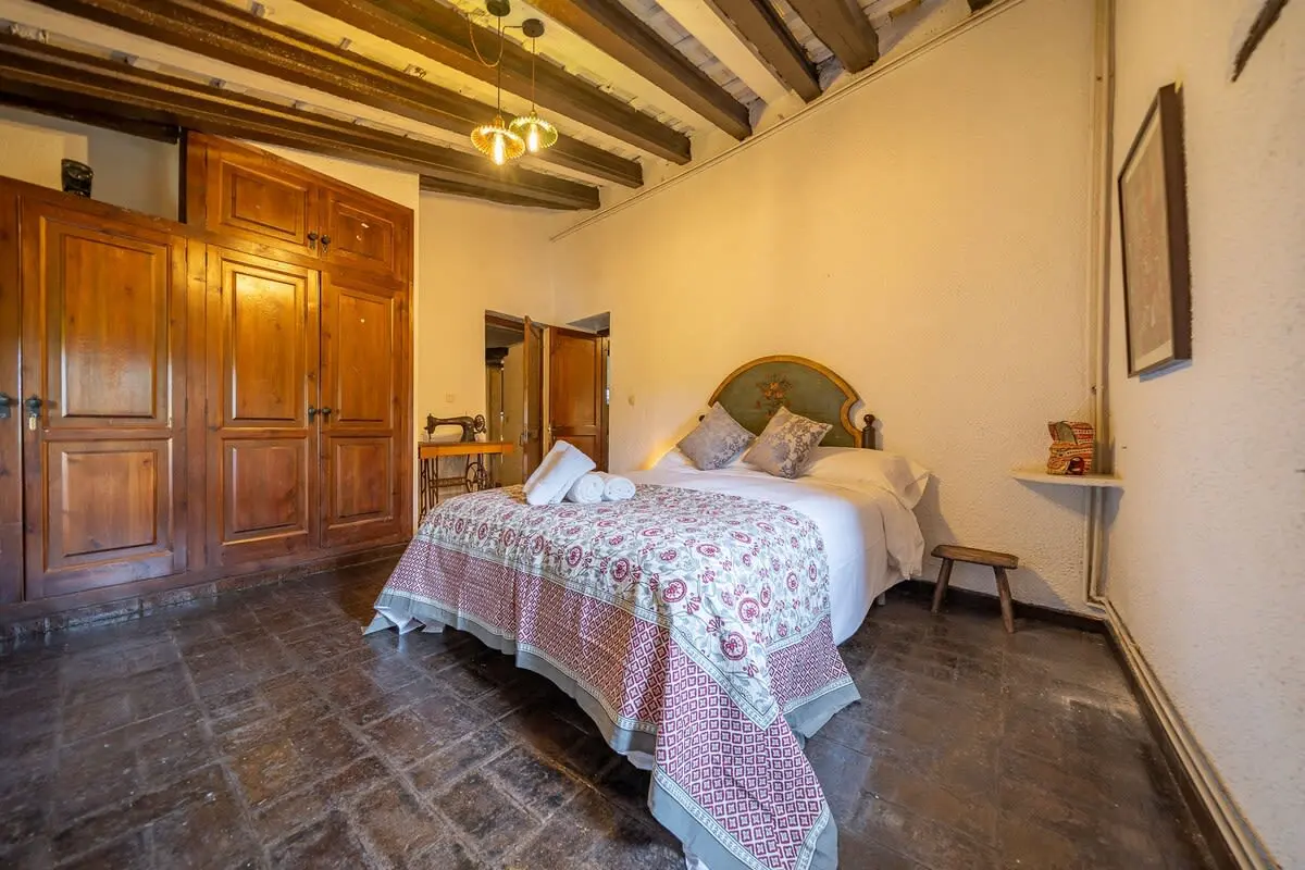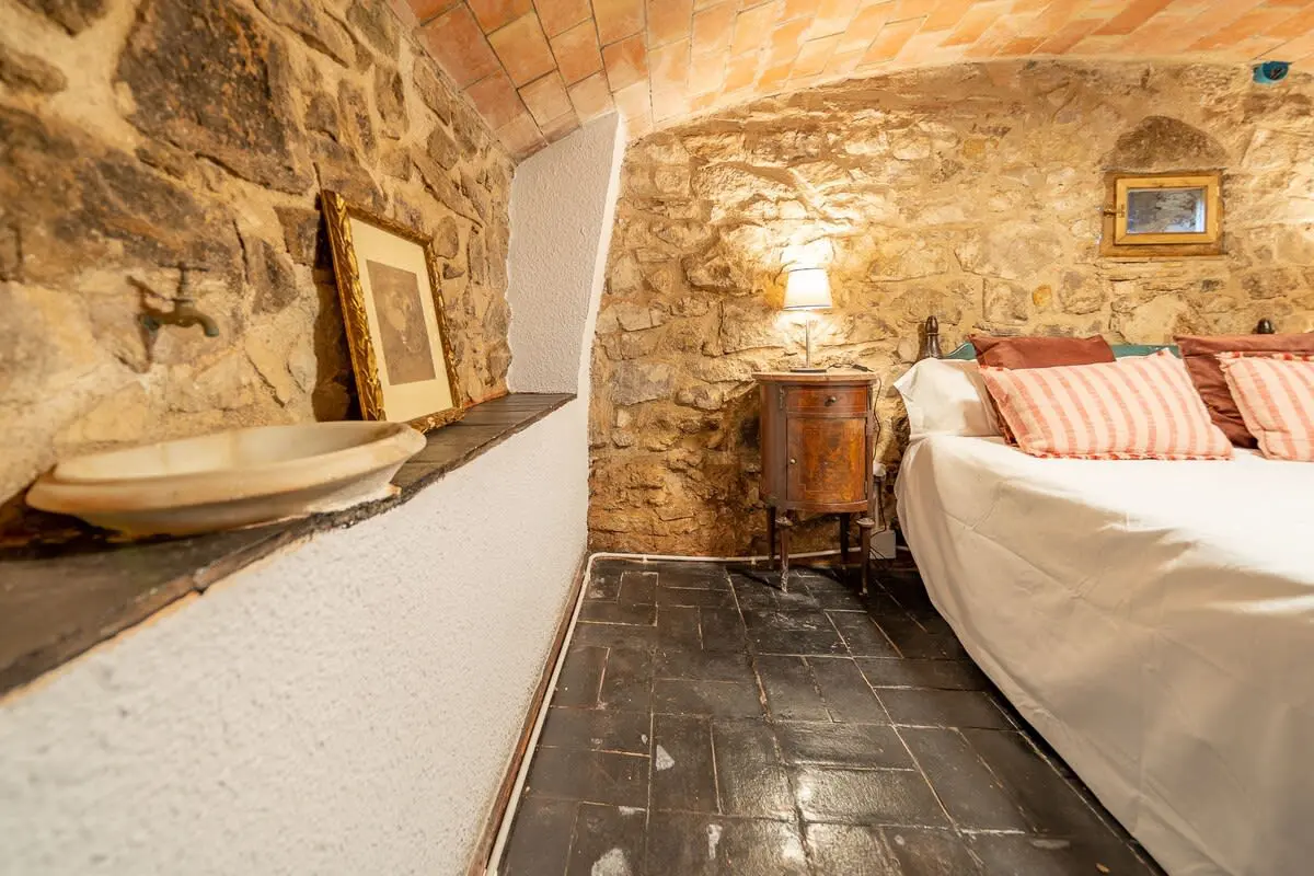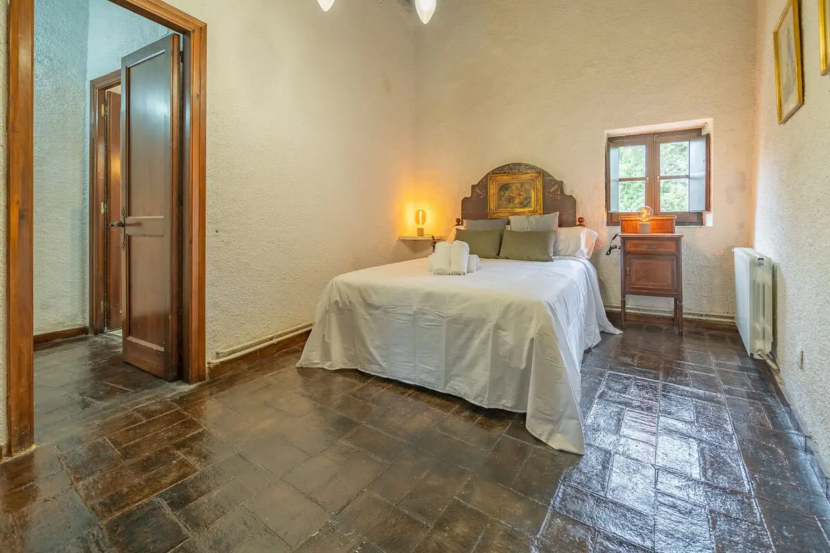 Inside the farmhouse, you will find space for up to 14 people, distributed in 7 rooms: 6 on the first floor, including a romantic suite with a king-size bed and bathtub with panoramic views, as well as a toilet, and another double room with en-suite bathroom and bathtub. In addition, there are three double bedrooms and a single bedroom, together with a bathroom with shower. On the ground floor, you have a charming double bedroom with stone walls and two bathrooms with shower.