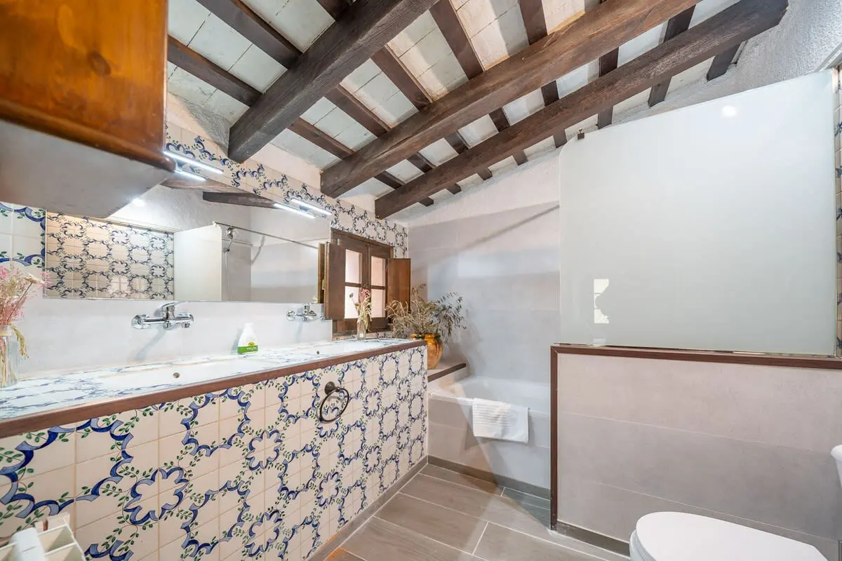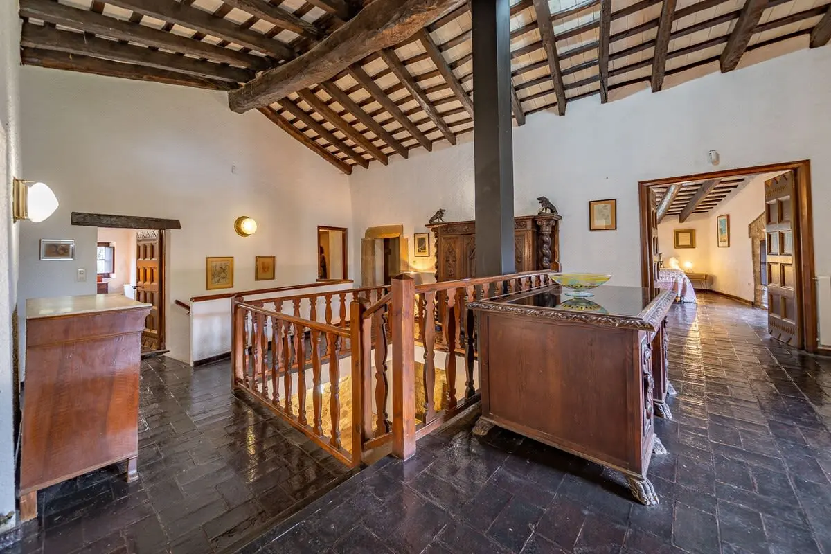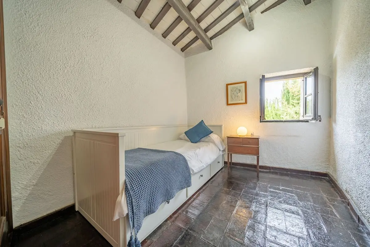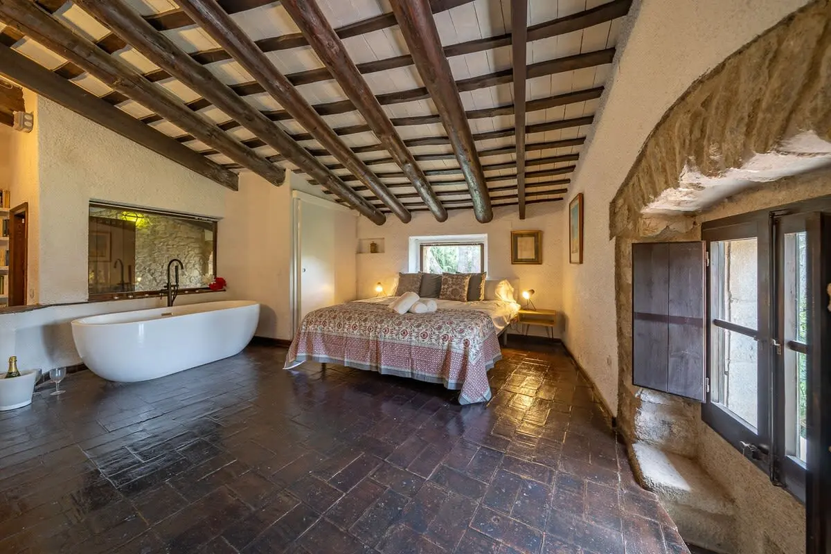 Inside the farmhouse, you will find space for up to 14 people, distributed in 7 rooms: 6 on the first floor, including a romantic suite with a king-size bed and bathtub with panoramic views, as well as a toilet, and another double room with en-suite bathroom and bathtub. In addition, there are three double bedrooms and a single bedroom, together with a bathroom with shower. On the ground floor, you have a charming double bedroom with stone walls and two bathrooms with shower.