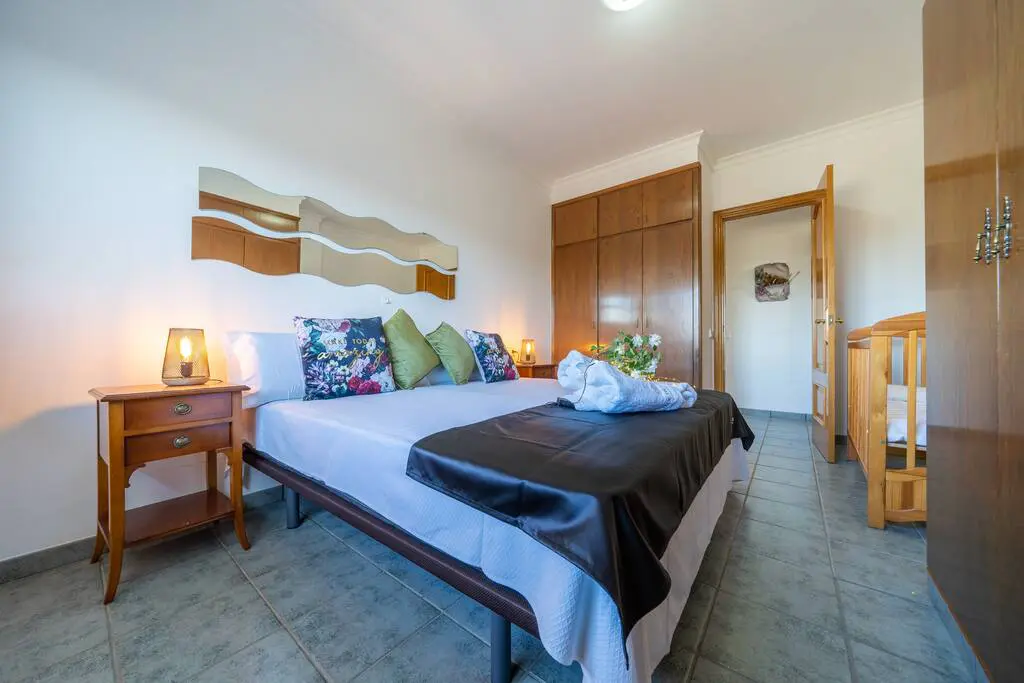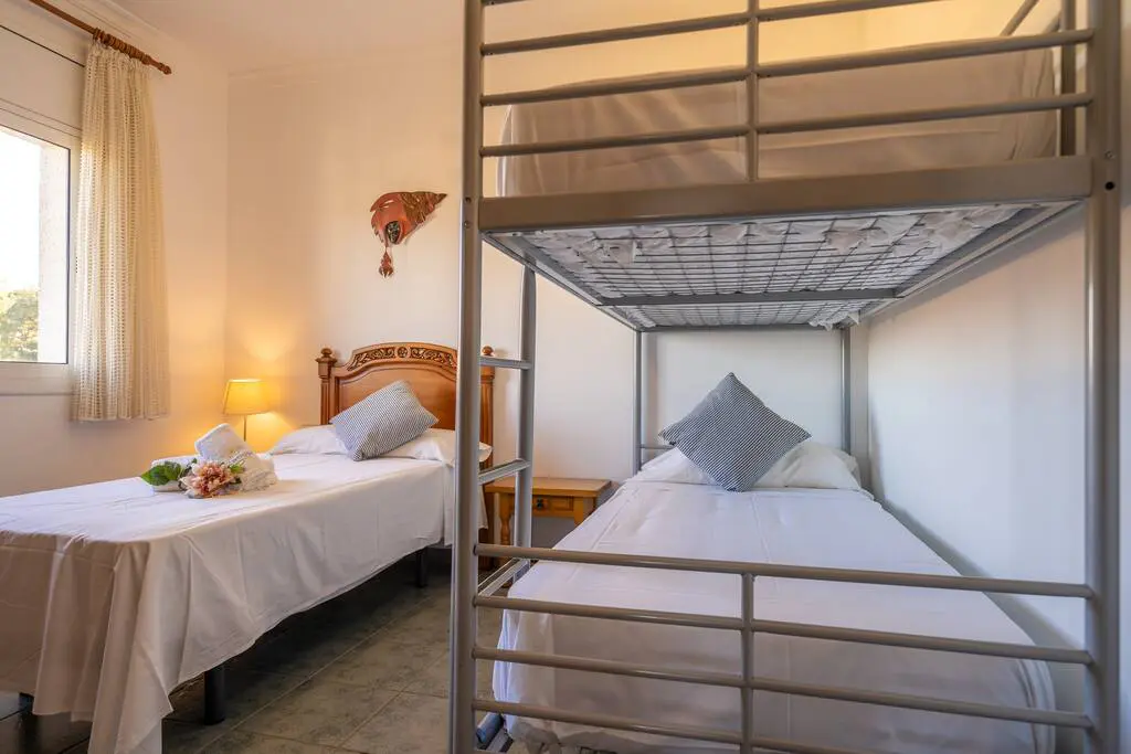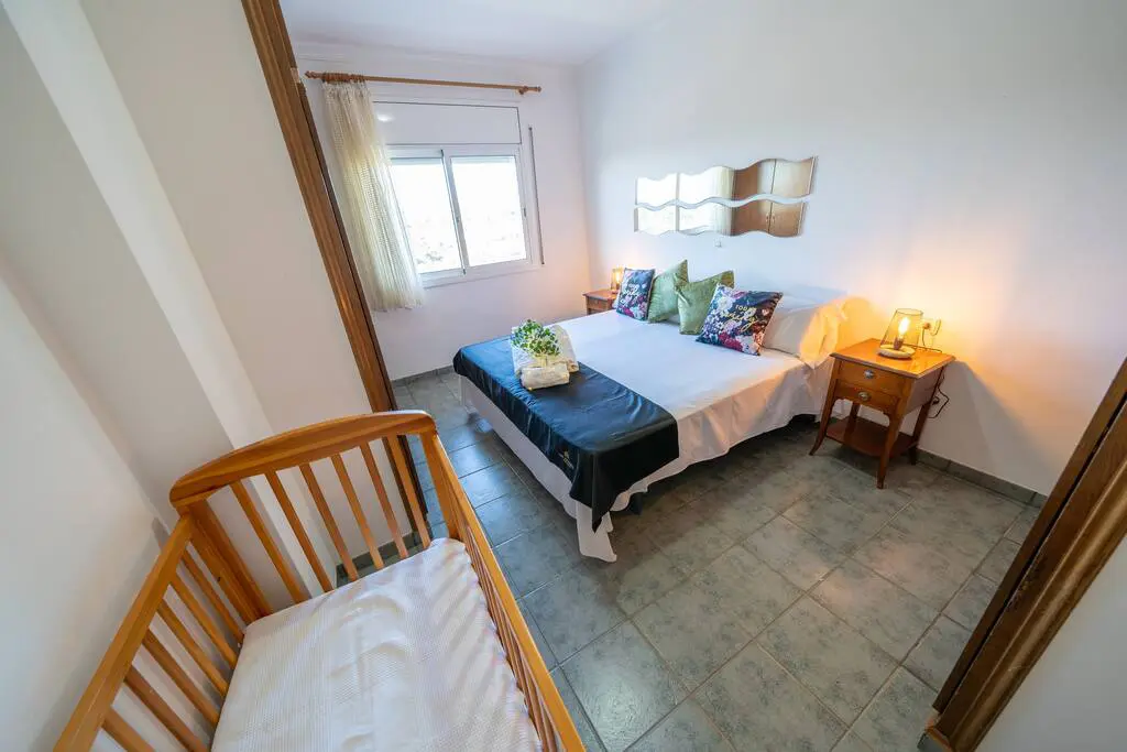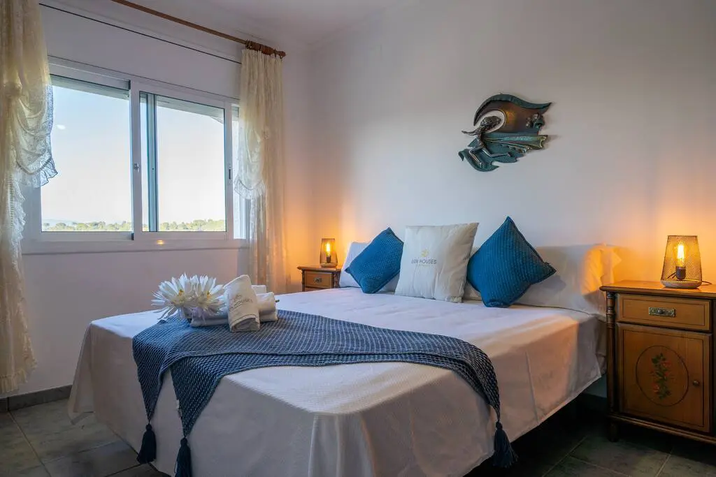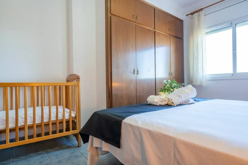 The villa has three bedrooms: two of them are furnished with 180 cm King size beds, while the third has a single bed and a bunk bed for two people. Additionally, a crib is available for families who need it.
