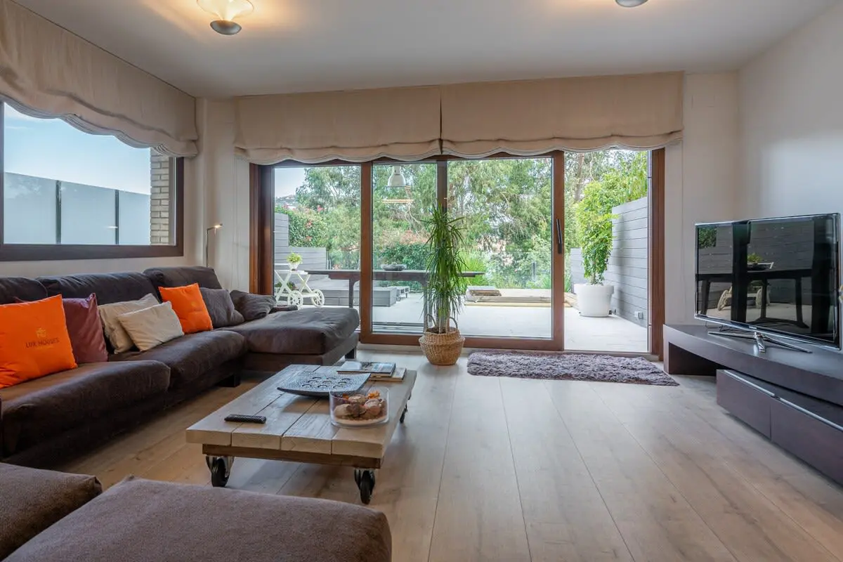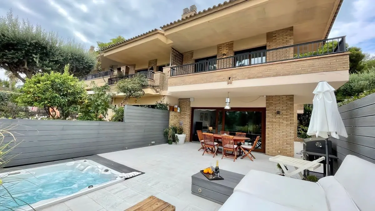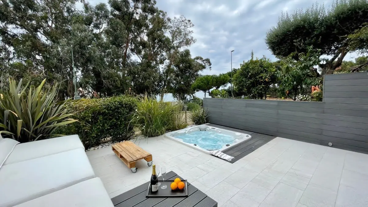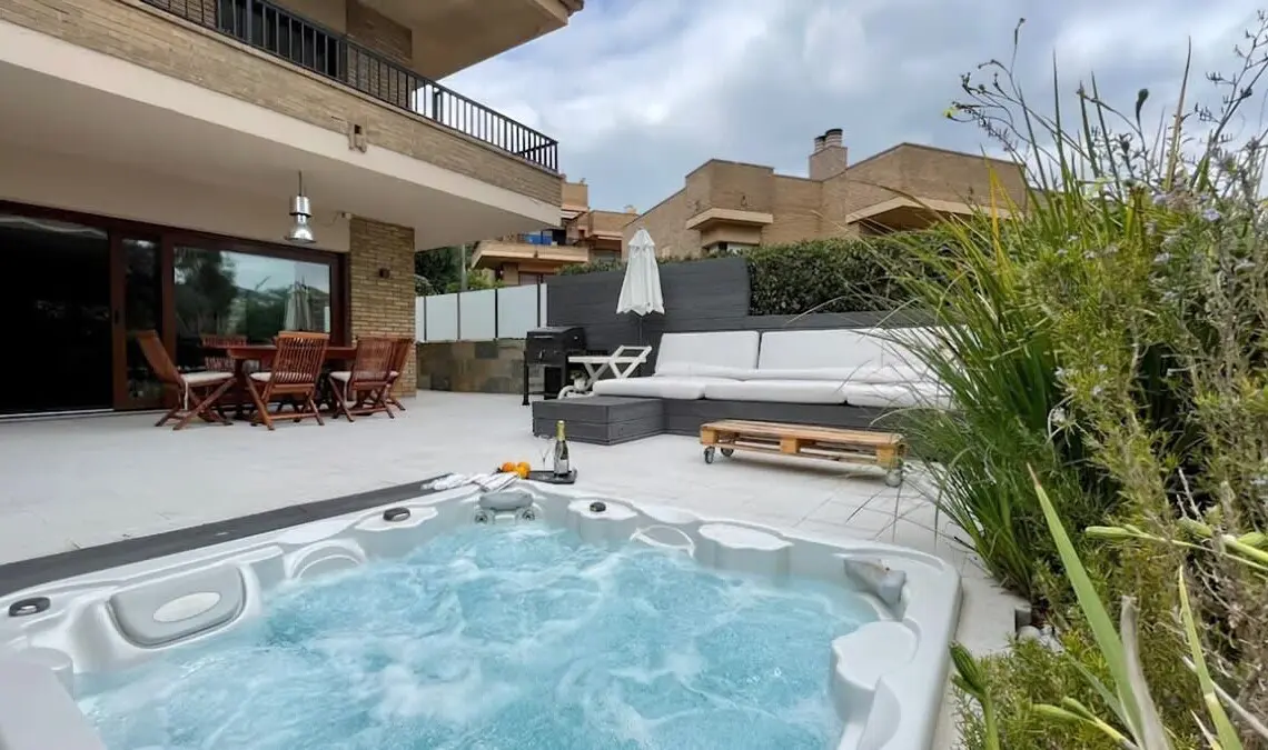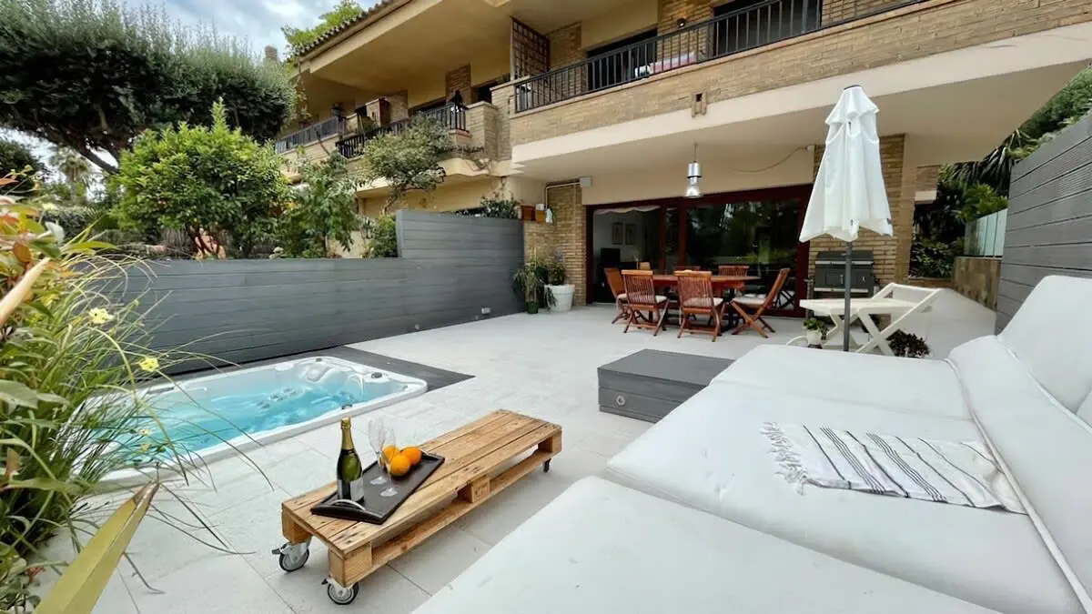 On the main floor we discover a large living room with dining area for 8 people, living area with Smart Tv and fully equipped kitchen, from the living room we go out to a large terrace, garden, chill out area and a great private jacuzzy that will make the nights in front of the sea unforgettable moments, we also have barbecue and dining area.