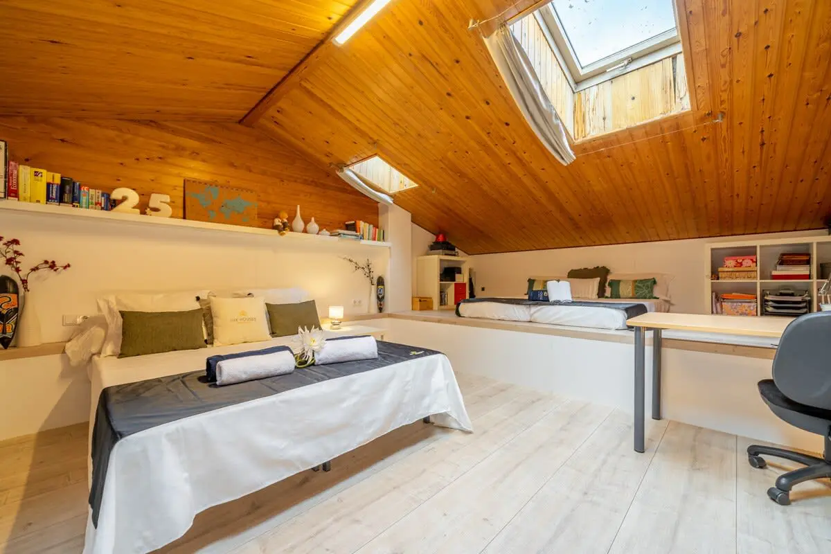 2 bedrooms with double beds and bathroom with large shower. On the upper floor we have the large loft and play area, perfect for children with single beds.