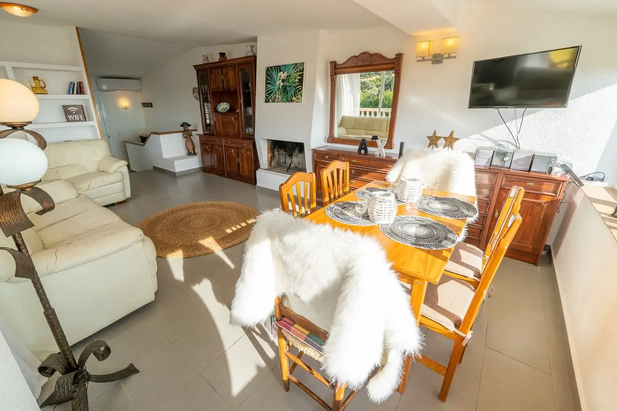 On the upper floor we find the fully equipped kitchen, a toilet and a bright living room with access to a terrace, which has a barbecue and outdoor dining area.