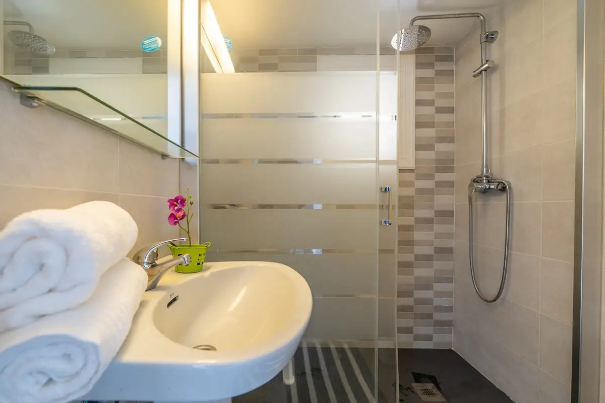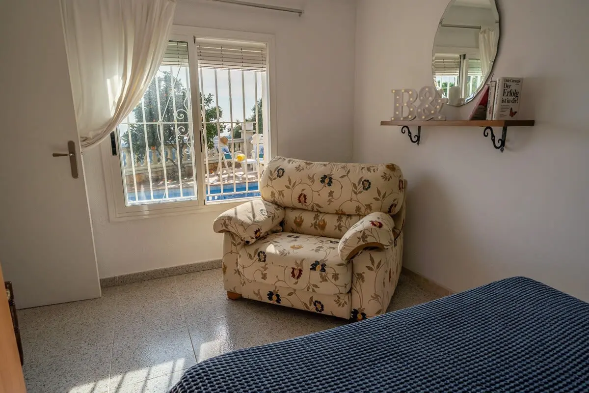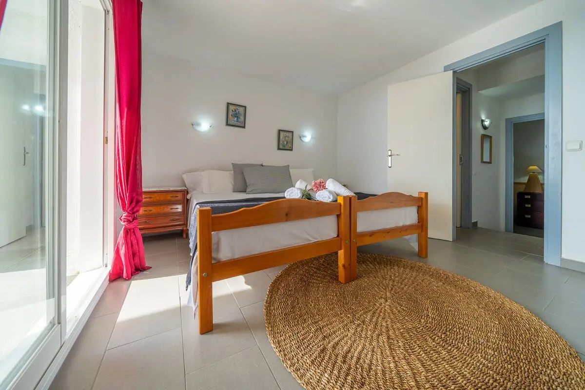 On the ground floor of the villa there are 3 double bedrooms (two of them with a double bed and one with two beds, plus an extra bed) and 2 bathrooms, one of them with a large shower and direct access to the pool.